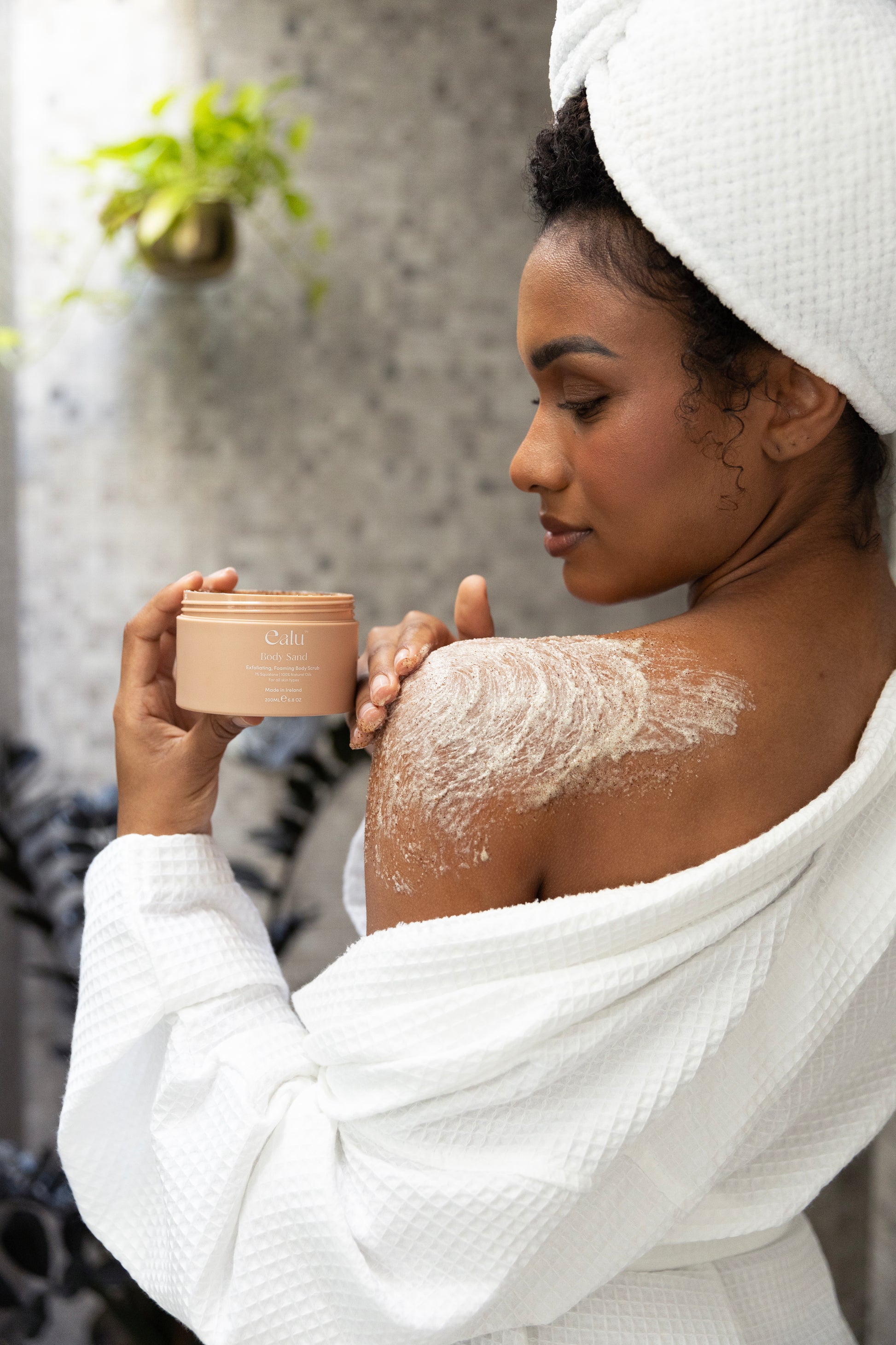 Create a lather by rubbing a generous amount of Body Sand between damp hands. Then scrub that day away, paying extra attention to any dry areas such as elbows and knees. For best results, moisturise skin after with Ealu’s Body Drench.