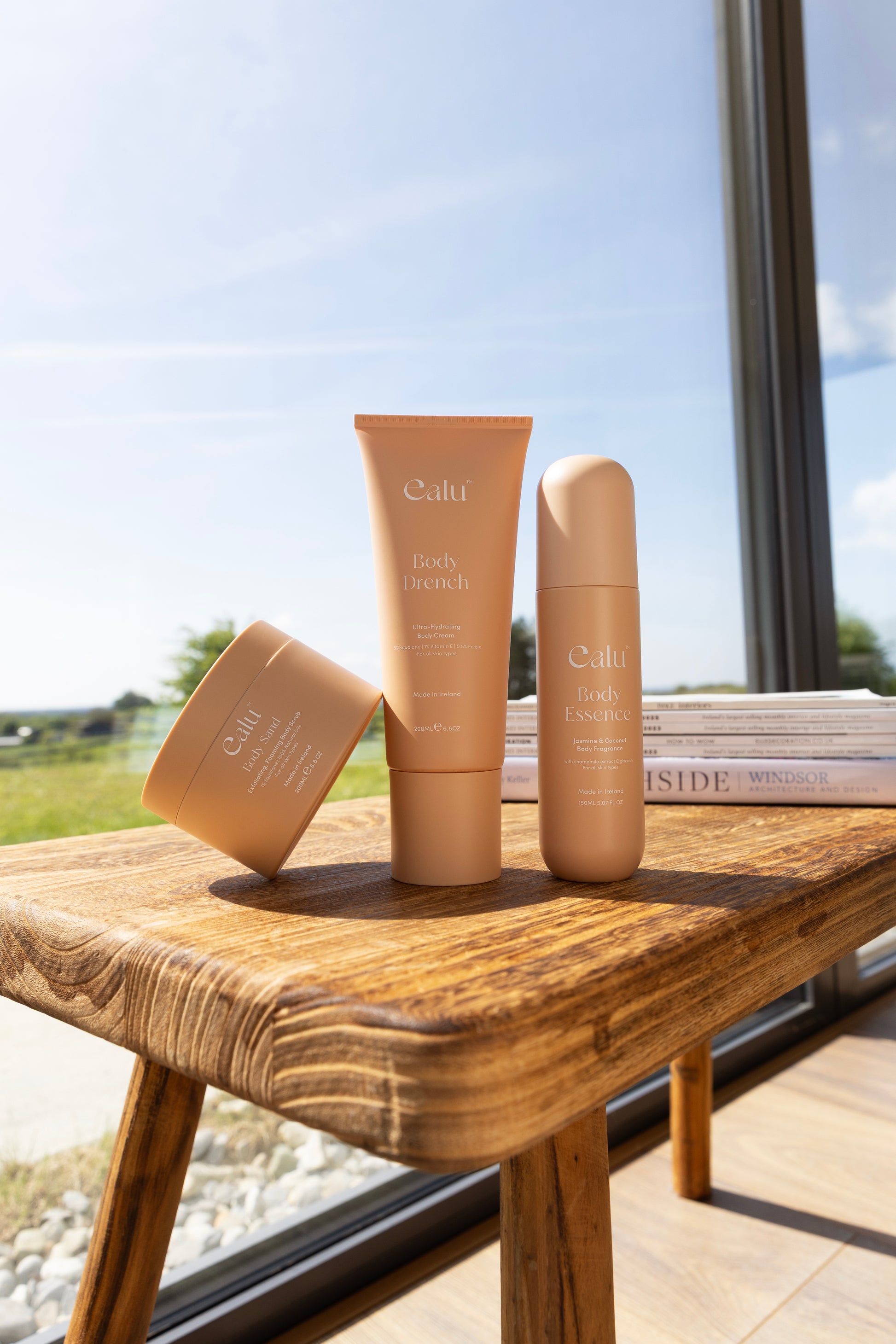 'Ealu's Starter Kit' includes 3 full-sized products - Body Sand (200mls), Body Drench (200mls), and Body Essence (150mls) - at a discounted price.